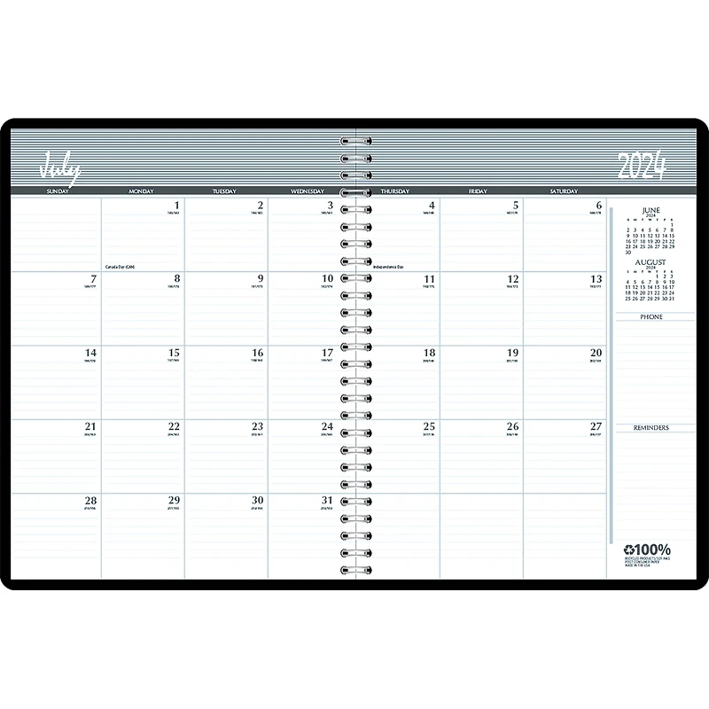 This academic planner book includes 14 months: July 2019 - August 2020. It contains Julian dates and days remaining. Features the previous and the following month reference calendar on each month. Printed on 100% post-consumer recycled paper with soy ink. Details: Black 8.5" x 11" (21.59cm x 27.94cm) planner size 2.125" x 1.875" (5.4cm x 4.8cm) block size 14 month calendar from July 2019 - August 2020 Includes Julian dates and days remaining One month per two-page spread Lightly ruled daily blocks Embossed simulated leather cover