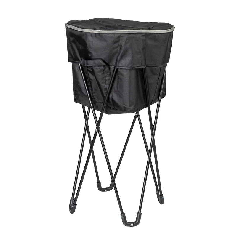 This thermal standing cooler is bound to be a crowd-pleaser at your next get-together or sports event. By combining an innovative seamless thermal inner lining, high-quality materials and convenient features, this standing cooler will keep your favorite beverages refreshingly cold and easy to access. The black cooler bag can be lifted off its legs to be relocated or used independently on a picnic table or other surface making it perfect for camping, sports events, barbecues with the neighbors and much more. Details: Black 18" x 18" x 33" standing thermal cooler size 35.8" x 5.11" x 5.31" folded cooler size Supports up to 20 lb. of refreshments Foldable with travel bag for easy transport Zippered lid and quick access top Hook and loop opening for quick grab-and-go refreshments Leak-resistant sonic welded polyethylene liner for seamless construction Heavy-duty 600D polyester and black powder coated steel legs For indoor and outdoor use