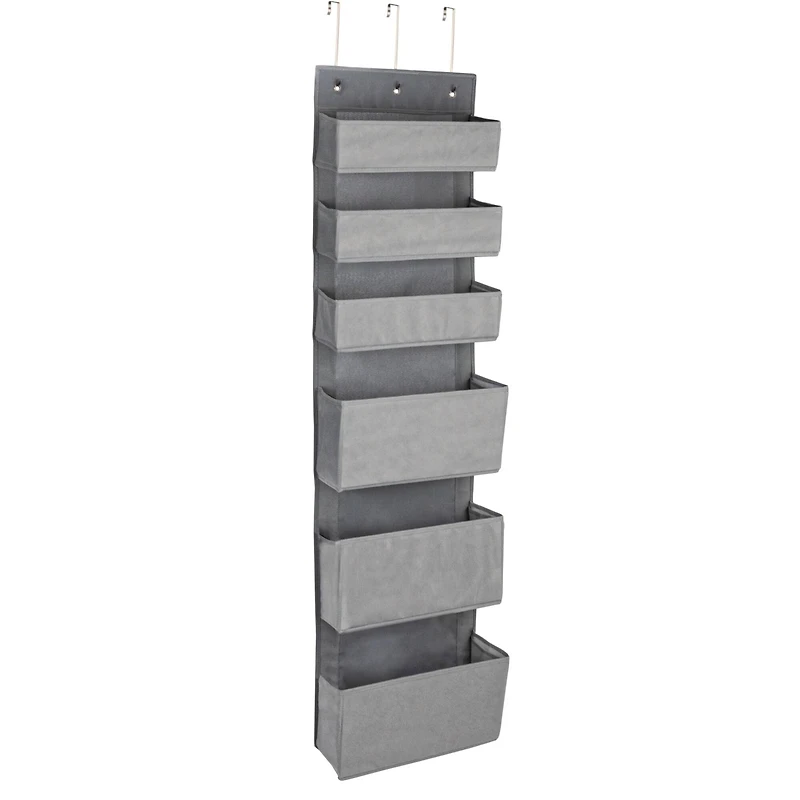 This over the door pocket organizer uses space behind the bedroom, bathroom or pantry door as a compact storage option for sorting toiletries, office supplies, accessories and more. To accommodate for a wide variety of items, the bottom three pockets are made two inches deeper for taller objects such as chip bags, cleaning solution bottles, spray cans and more. The three shallow pockets at the top are five inches deep and great for spices, bundles of yarn, snack bags and small boxes. This organizer hangs on three hooks for advanced stability and comes with two sets of hooks to be used on either residential or commercial doors. When not in use, this organizer can be quickly folded and tucked away for compact storage until needed again.Details:Gray6 pockets in two different heights5 lb. maximum weight capacity per pocketReinforced siding with plastic side inserts and solid bottom pocketsTapered pocketsFoldable and versatileComes with two sets of hooks for hangingPolypropylene non-woven fabric, plastic and metalCompatible with most residential and commercial doorsSize Information:53.5" overall organizer height5" hanger height14.5" wide7" large storage compartment height4" small storage compartment height7" large storage compartment depth5" small storage compartment depth