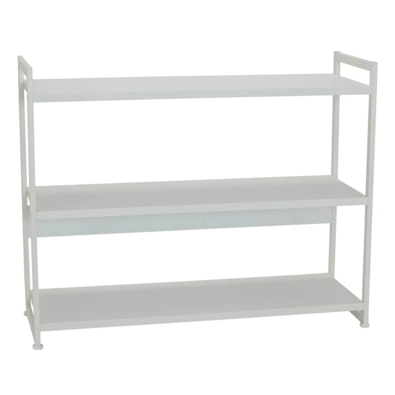 This bookshelf features long and low, free standing shelves with three shelves. The wide shelves are braced, and supported by metal side frames. The metal side frames have round feed to protect flooring. The sturdy shelves are made from a laminate surface that is strong, beautiful, and easy to care for. It is ideal for storage and display, this low shelf provides storage under windows, mirrors, and large clocks. It’s also the ideal height for common areas to have ample storage without blocking a room’s line of sight.