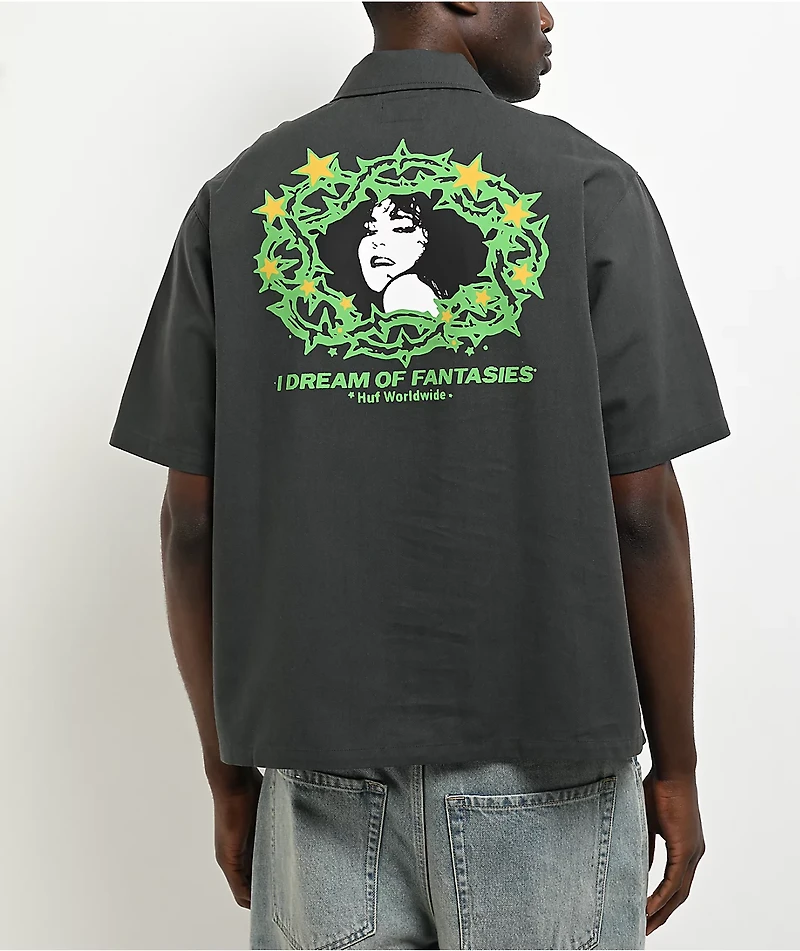 Green woven construction meets bold and edgy graphics on the Fantasies Woven Short Sleeve Button Up Shirt from HUF. An embroidered logo sits on the left chest, while a screen print spans the back for contrast. Finished with dual button-flap chest poc