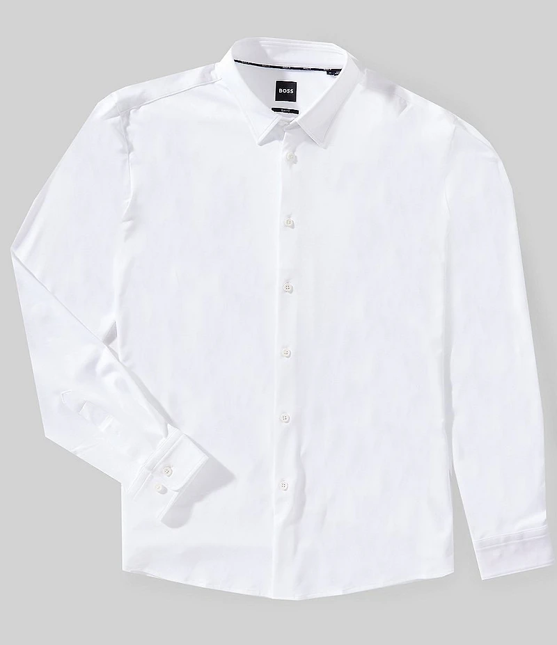 From Hugo Boss, this shirt features: Solid tone Point collar Long sleeves Button-front closure Round cuffs and hem Slim fit Stretch fabric Polyamide/polyester/elastane Machine wash/line dry Imported.