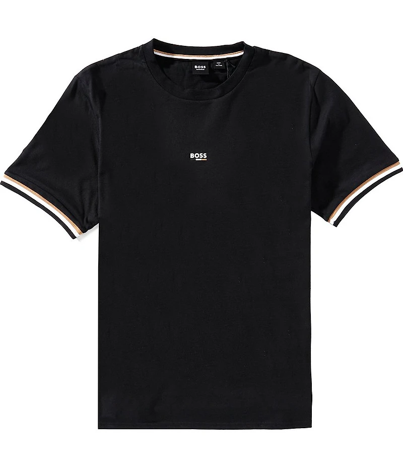 From Hugo Boss, this t-shirt features: Crew neckline Short sleeves with stripe detailing around the arms "Hugo Boss" printed on the center chest Pullover construction Cotton Machine wash/dry flat Imported.