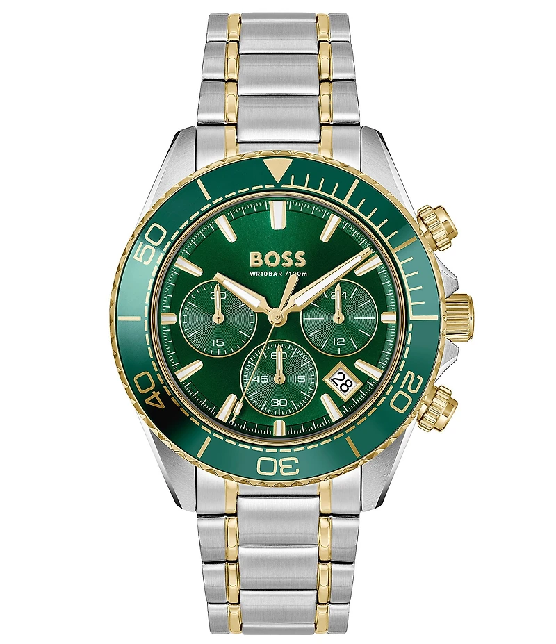 From Hugo Boss, this men's watch features: Stainless steel bracelet and case Sunray dial Push button deployment closure Quartz chronograph movement Case size approx. 41mm Case thickness approx. 11.6mm Water resistance: 5 ATM Imported.