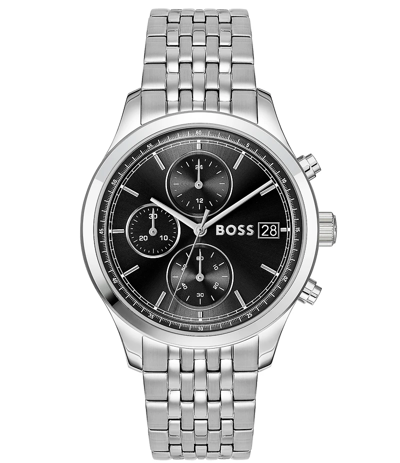 From Hugo Boss, this men's watch features: Stainless steel bracelet and case Sunray dial Push button deployment closure Quartz chronograph movement Case size approx. 41mm Case thickness approx. 10mm Water resistance: 5 ATM Imported.