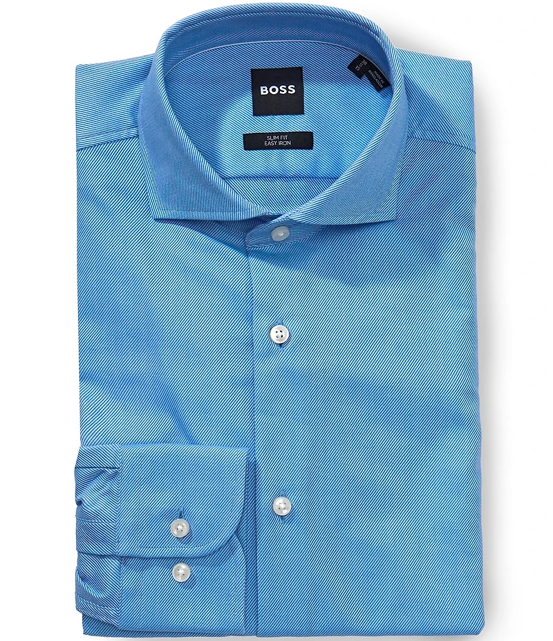 From Hugo Boss, this dress shirt features: Diagonal stripe twill fabrication Slim fit Spread collar Long sleeves with button round cuffs Button front closure Rounded hem Cotton/elastane Machine wash cold/dry flat Imported.
