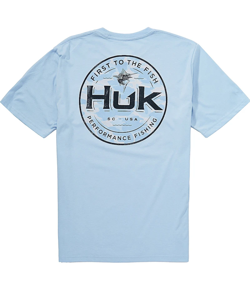 From Huk, this t-shirt features: Crew neckline Short sleeves Small circle-shaped graphic with "Huk" logo, marlin graphic and other verbiage on the front chest pocket Large circle-shaped graphic with "Huk" logo, marlin graphic and other verbiage on the back Pullover construction Cotton/polyester performance blend Machine wash/tumble dry Imported.
