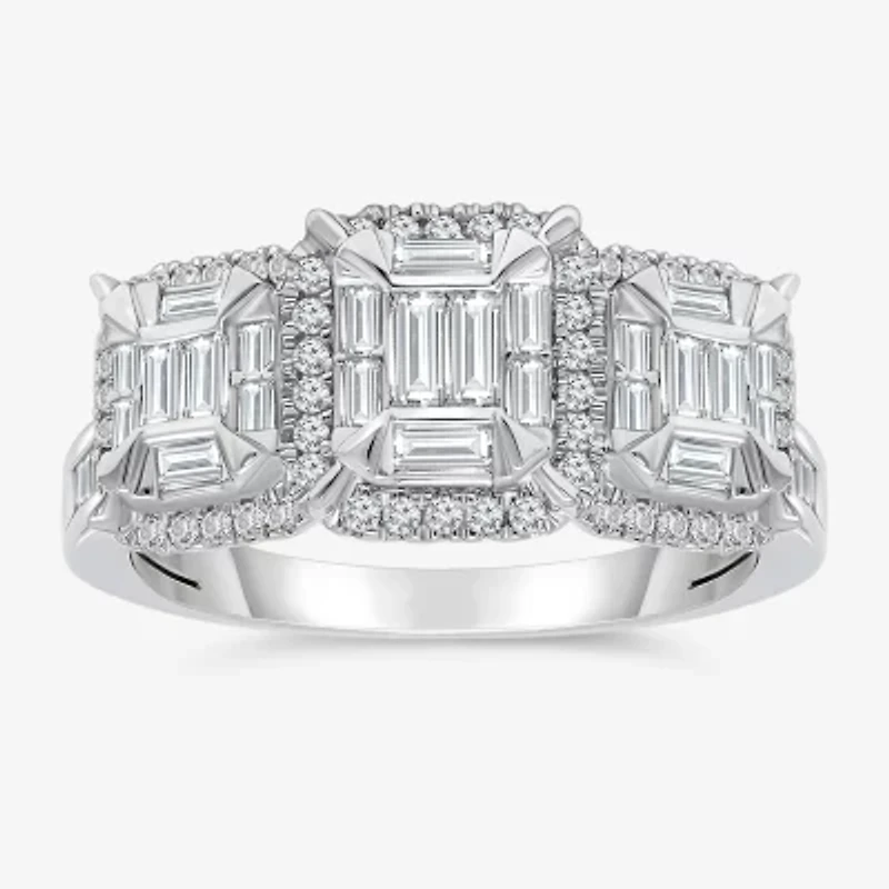 For a unique engagement ring that's a sparkling sculptural work of art in its own right, you'll adore this style from the Modern Bride collection. This ornate stunner is crafted from 10K White Gold with 1 carat of Lab-Grown Diamonds in total adorning the emerald shape trio ring design in assorted baguette and round cuts.