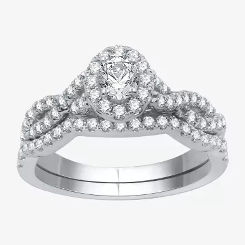 This striking bridal set captivates the heart with an engagement ring that features an oval-cut Lab-Grown Diamond at the center surrounded by a halo and accented with a twist shank. Set in 14K White Gold Over Sterling Silver with a 1 carat total weight, the set also features a wedding band lined with stones that nestles perfectly against the engagement ring.