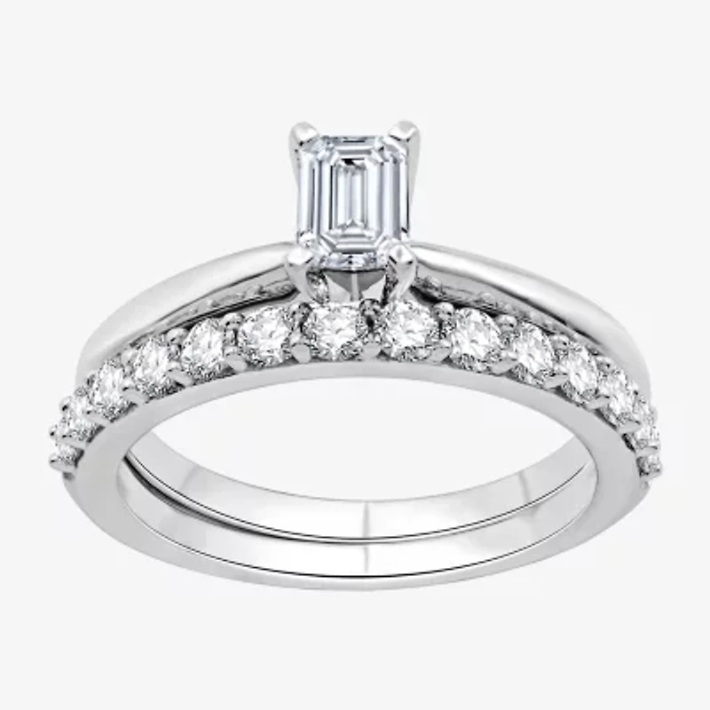 This women's bridal set is a timeless choice to symbolize everlasting love. It features a solitaire engagement ring starring an emerald-cut Lab-Grown Diamond prong set in Sterling Silver paired with a pav� wedding band.