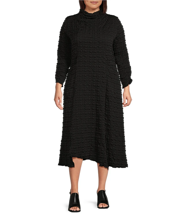 IC Collection Plus Size Textured Bubble Check Pucker Woven Mock Neck Long Sleeve Asymmetrical Hem Pocketed Sheath Midi Dress