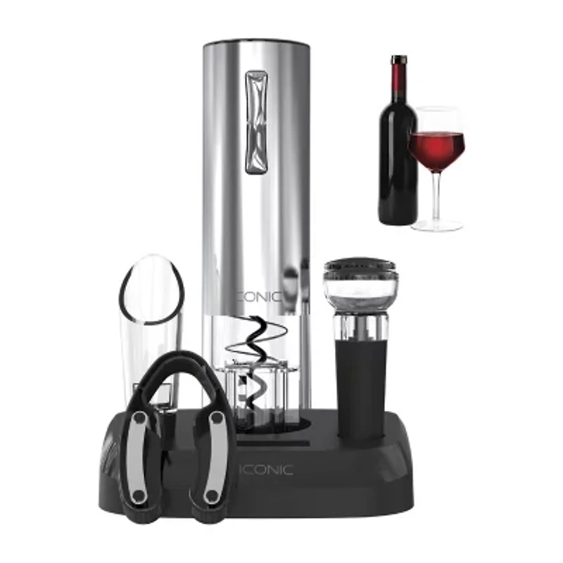 Liven up any social gathering with the Iconic 5-in-1 Wine Set! You’ll only need a few seconds to open your wine bottles thanks to the electric corkscrew wine opener’s high-powered motor, and the foil cutter that removes practically any foil seal. This wine kit also features two vacuum stoppers that easily reseal your opened bottles, and an aerating pourer for spill-free glass filling (and refilling). Plus, the base not only keeps the Iconic 5-in-1 Wine Set neatly organized, but also charges the electric wine opener when not in use. This set is all you need to pour the perfect glass of wine!