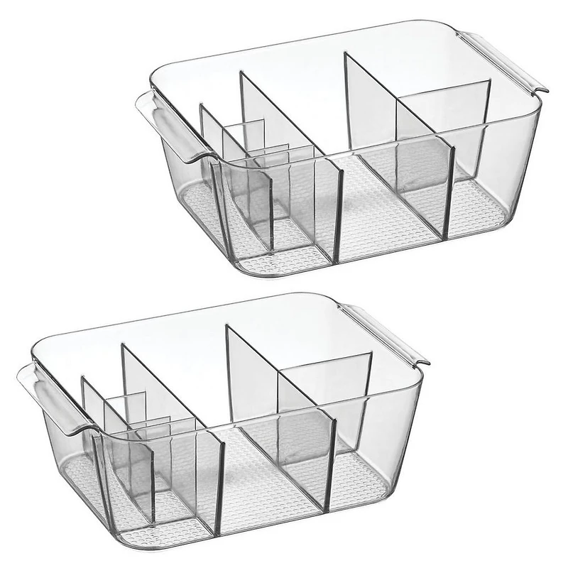 8-Section Makeup Organizer. Benefits: Divided Organizer - This makeup organizer streamlines everything from tools and brushes to lipsticks and serums in eight perfectly sized sections for quick visibility and custom storage. Compact Designed with a small footprint, this vertical organizer keeps personal care items upright and within easy reach, helping save valuable space on countertops or vanities. Carry Handles - Its compartmentalized design keeps items separated and easy to grab, and the integrated carry handles facilitate easy transport around the bathroom or wherever you need. Features: Construction - Made of BPA-free plastic that is shatter-resistant; EASY CARE - Clean with mild soap and water; Do not place in the dishwasher. Dimensions - Makeup organizer measures 7" x 10.4" x 3.6" high. Features: MULTI-PURPOSE STORAGE - This bathroom counter organizer and makeup brush holder extends beyond beauty needs; Use it to organize craft supplies, stationery, or sewing materials. The clear design lets you spot items at a glance and save time.
