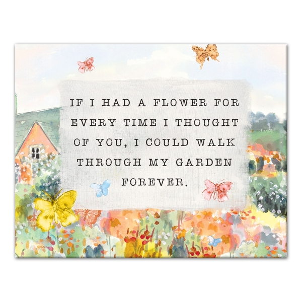 The If I Had a Flower Canvas Art Print will make a lovely statement in your home! Featuring a colorful garden and sweet sentiment, it's sure to give you a warm and fuzzy feeling. Art measures 14L x 1.25W x 11H in. Distinctively printed on stretched canvas Wrapped edges complete the look Features the text "If I had a garden for every time I thought of you, I could walk through my garden forever. Hues of green, orange, blue, yellow, gray, white, and black Weight: 0.9 lbs. Hangs from back-mounted hardware Designed and printed in the USA Care: Dust with a soft, dry cloth. This item is available at Kirklands.com only, not available in stores. Please note: this item cannot be shipped to APO/FPO addresses.