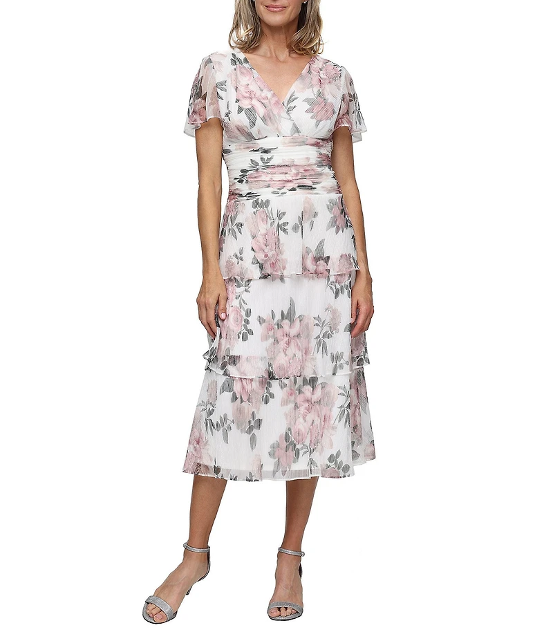 From Ignite Evenings, this dress features: Bodre fabrication V neckline Short sleeves Lined Floral print Tiered skirt Flutter sleeves Back zipper closure Approx. 43.5" in length Polyester Hand wash cold Imported.