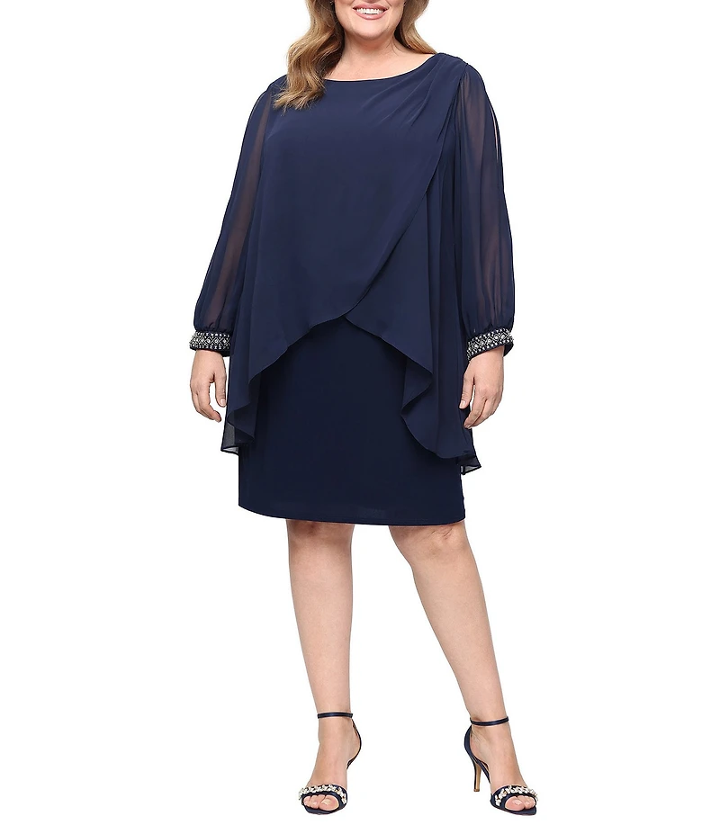 Ignite Evenings Plus Size Tulip Overlay Boat Neck 3/4 Split Sleeve Sheath Dress