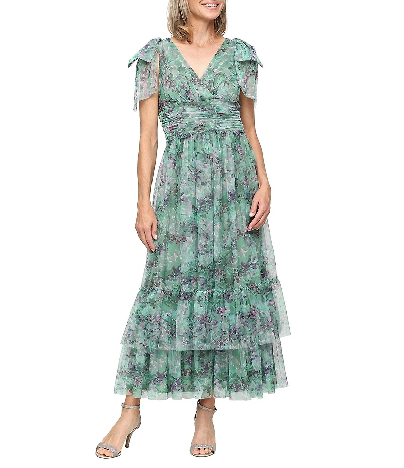 Ignite Evenings Printed Mesh Bow Double Tier Hem Midi DressIgnite Evenings Printed Mesh Bow Double Tier Hem Midi Dress