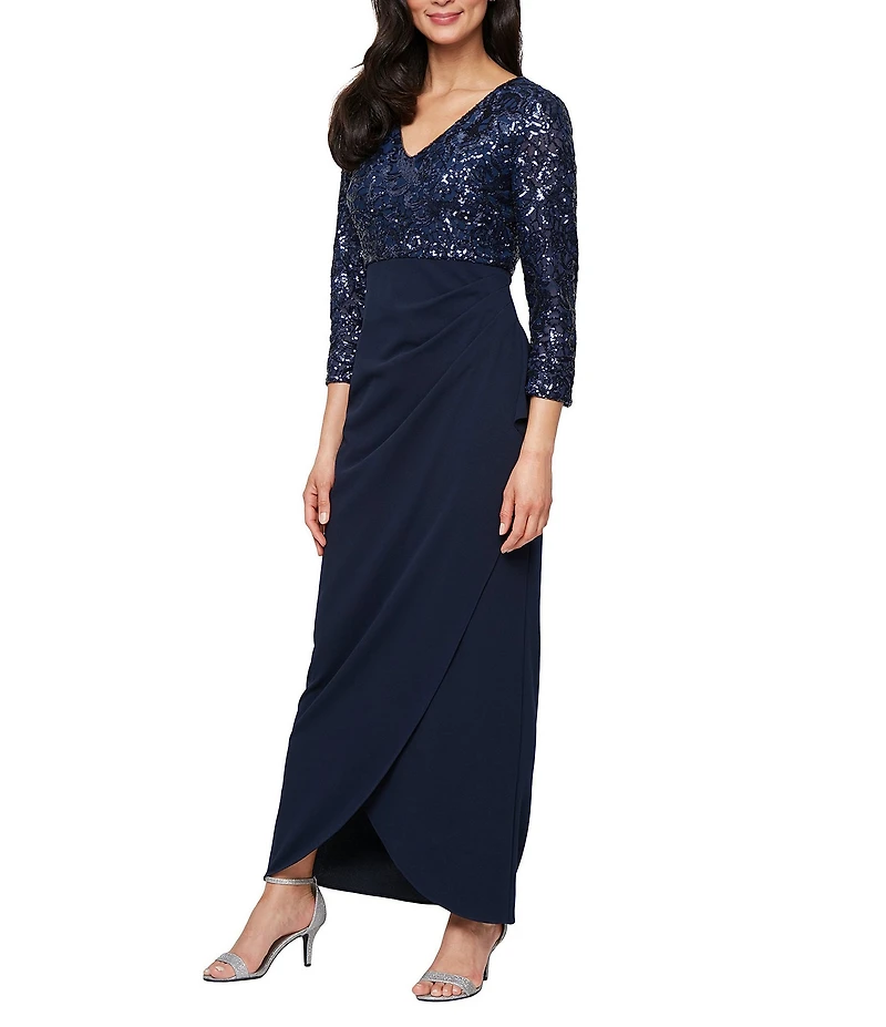 From Ignite Evenings, this dress features: Stretch sequin and scuba crepe fabrication V-neckline 3/4 sleeves Empire waist silhouette Cascade detail Lined Center zip back closure Approx. 56" in length Polyester/spandex Hand wash Imported.