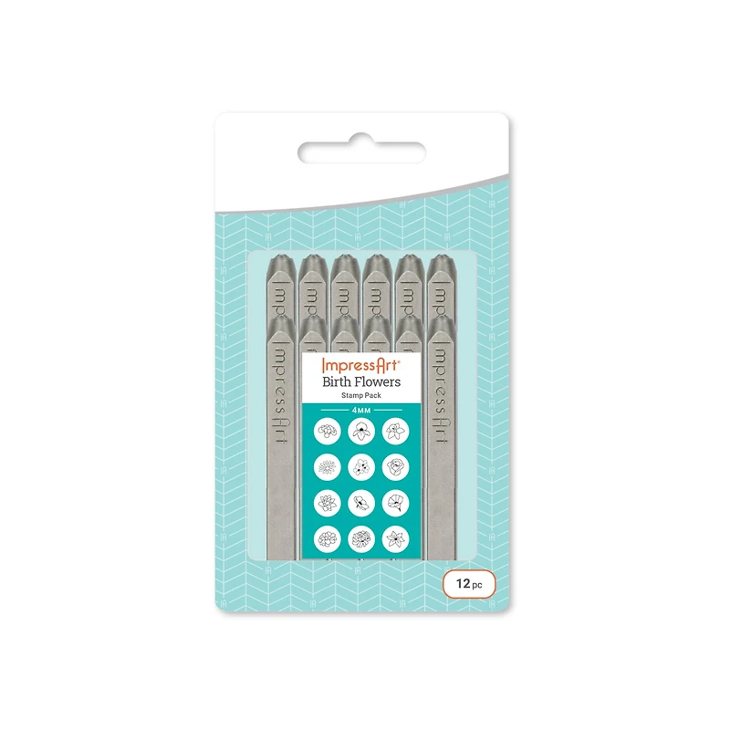 Add an extra touch of personalization to any hand-stamped piece with ImpressArt’s extensive selection of detail rich Design Stamps. ImpressArt Signature metal stamps are professional quality stamps, manufactured to the highest standard for durability and alignment. Stamps are engineered from hardened steel and rated to endure stamping on soft and hard metals up to Stainless Steel*. Sharp design edges ensure crisp, deep impressions project after project. Designs are marked on side of stamp for easy identification and orientation. Details: 4mmIncludes all 12 Birth Month Flower StampsExtra sharp character designs for crisp impressions Design marked on side of stamp for easy identification and orientation Rated for soft and hard metals up to Stainless Steel* Lightly coated with oil to prevent rust Contents:January: Carnation February: Violet March: Daffodil April: Daisy May: Hawthorn June: Rose July: Lotus August: Poppy September: Morning Glory October: Marigold November: Chrysanthemum December: Poinsettia *Rated for stamping on Alkemé, aluminum, pewter, copper, brass, silver, gold, & other metals up to 56HRC Rockwell Hardness.