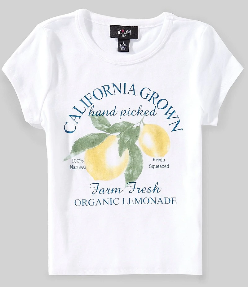 From I.N. Girl, this t-shirt features: Round neckline Short sleeves "California Grown" verbiage, lemon graphics and other verbiage on the front Pullover styling Cotton/polyester Machine wash/tumble dry Imported.