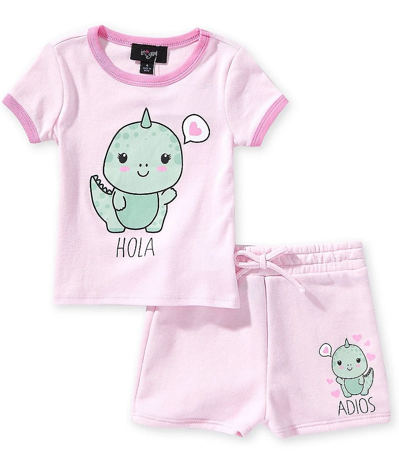 I.N. Girl Little Girls Short Sleeve #double;Hola#double; Dinosaur Tee & Pull-On #double;Adios#double; Shorts Set