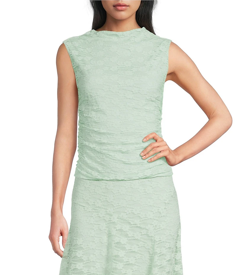 I.N. San Francisco Floral Printed Mesh Lace Mock Neck Shirred Side Top in Chattanooga, TN