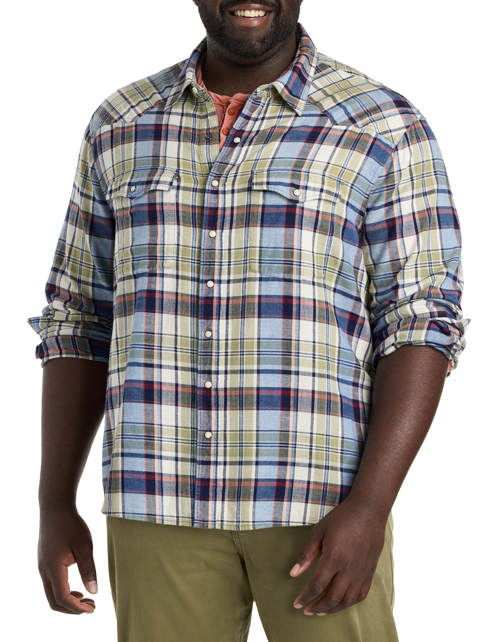 Whether you're a fan of the wild west, want to be a cowboy or just love the soft feel and relaxed comfort of 100% cotton, this Lucky Brand plaid shirt helps to evoke all the western vibes. Made from indigo-dyed cotton, the plaid, long-sleeve style features traditional tailoring like a spread collar, button-down front and double snap-button pockets and cuffs. Designed with an ideal fit for Big + Tall guys, it's easy to wear and allows for the freedom to move without restriction. Try it buttoned-up with jeans or layered over your favorite graphic tee.