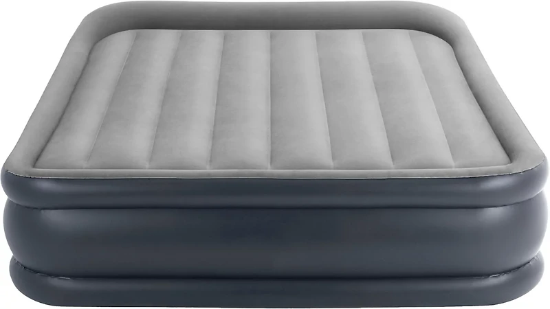 Sleep comfortably wherever you are with the INTEX Deluxe Queen Pillow Rest Airbed. This queen-sized air mattress features fiber-tech technology and flocked top and edge construction for comfort and stability. The soft, velvety sleeping surface and built-in pillow provide extra comfort, while the powerful internal pump with air lock allows for easy inflation and deflation.