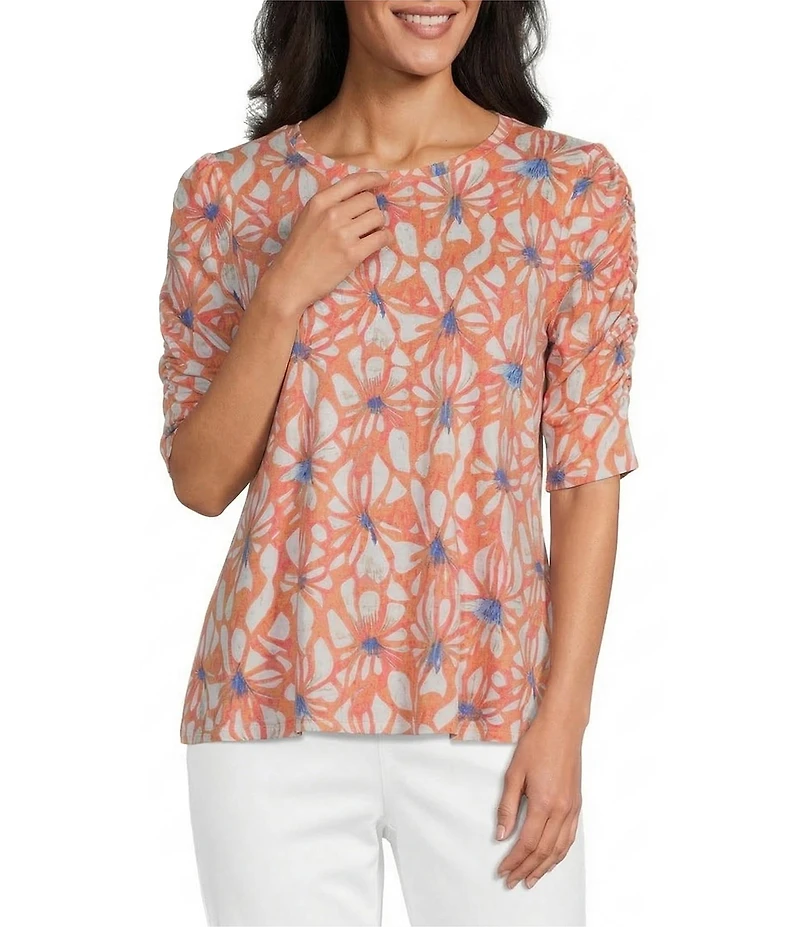 Intro Knit Jersey Shell Coral Crew Neck Elbow Ruched Sleeve Top