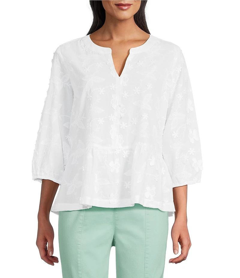 From Intro Petite, this blouse features: Schiffli cotton fabrication Split scoop v-neckline with ties 3/4 sleeves Embroidered floral motif Elastic opening shirred sleeves Peplum shirred hem Pullover construction Approx. 22.125" length Cotton Hand wash/line dry Imported.