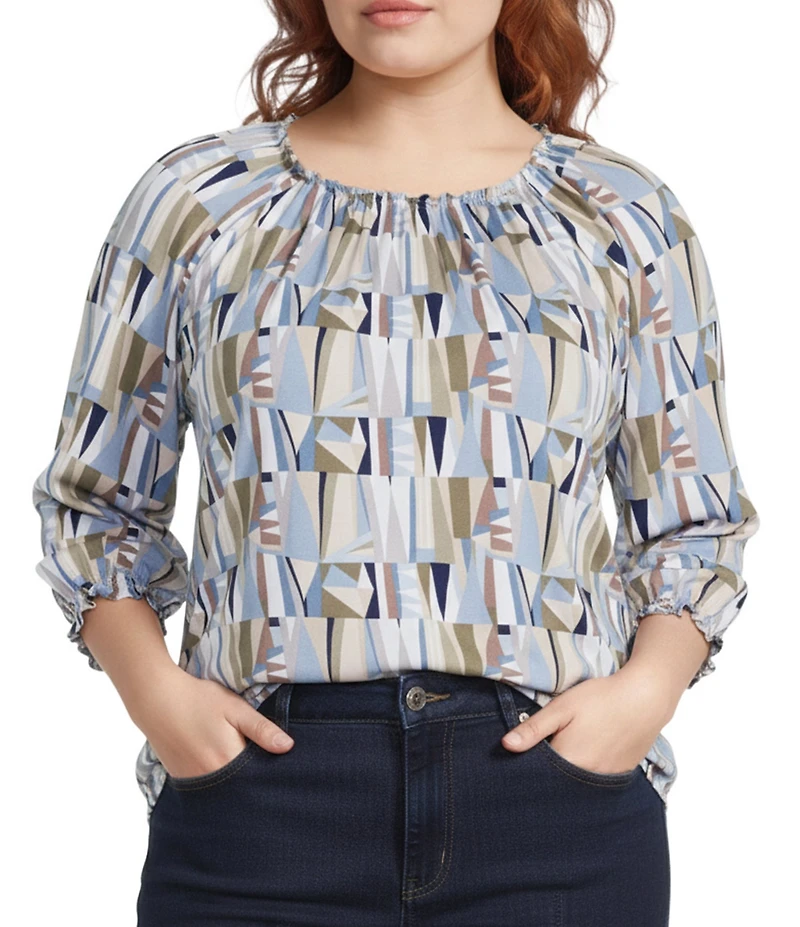 From Intro Plus, this blouse features: Knit jersey fabrication Scoop neckline 3/4 sleeves with elastic cuffs Abstract print Gathering detail Curved hem Pullover construction Approx. 24.875" length Rayon/spandex Machine wash/dry flat Imported.