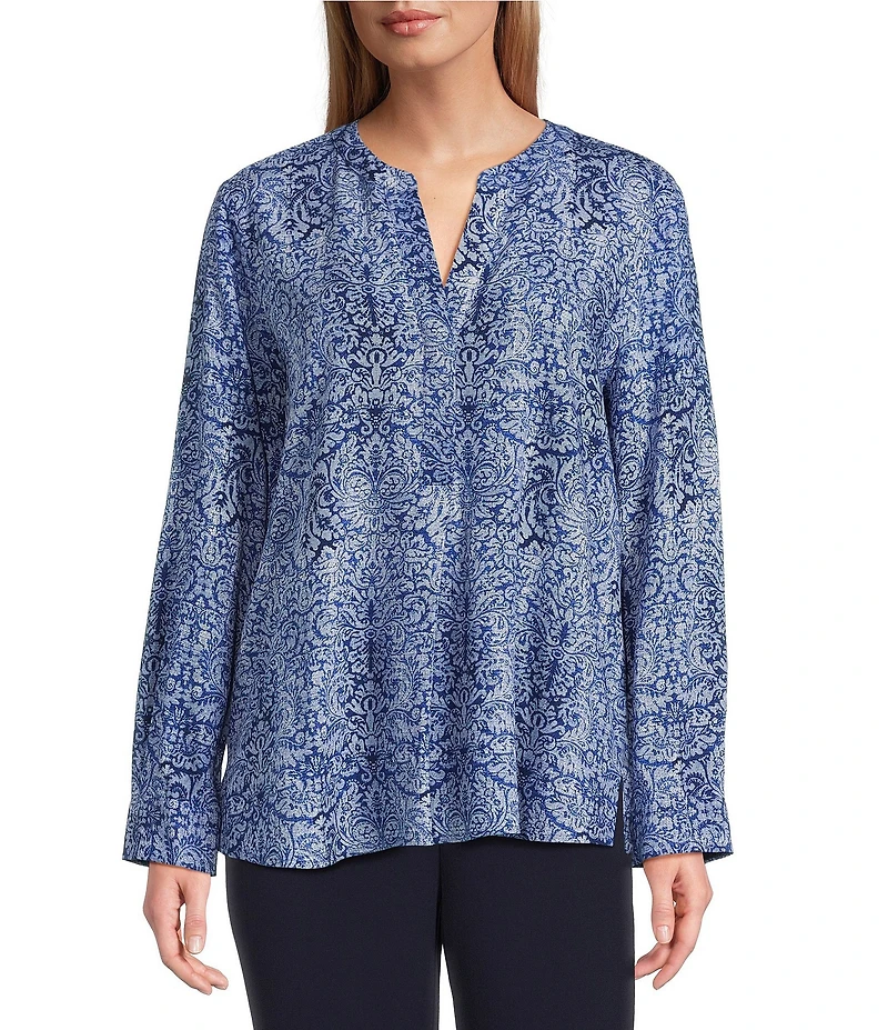 From Investments Petite, this blouse features: Mazarine scroll print Drapey twill fabrication Y-neckline Long sleeves Pullover construction Rayon Machine wash/dry flat Imported.