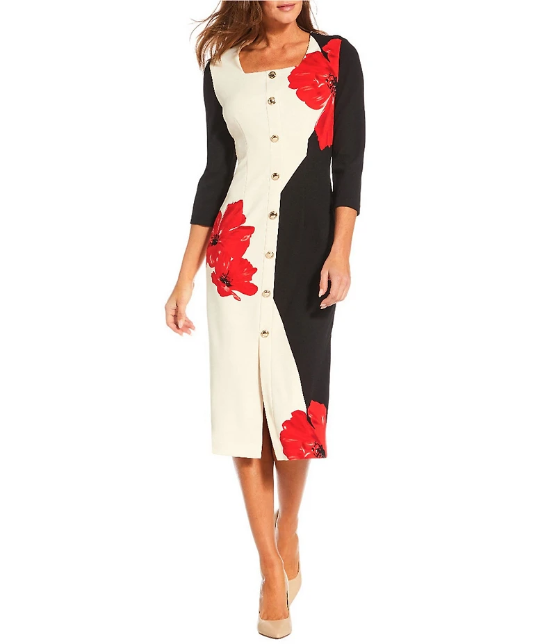 Investments Scuba Crepe Floral 3/4 Sleeve Faux Button Front Sheath Dress