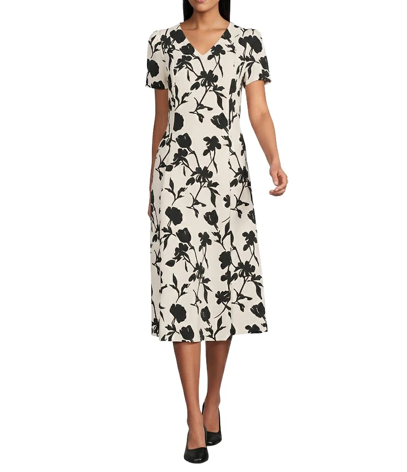 Investments Scuba Crepe Shadow Floral Short Sleeve Fit and Flare V-Neck Midi Dress