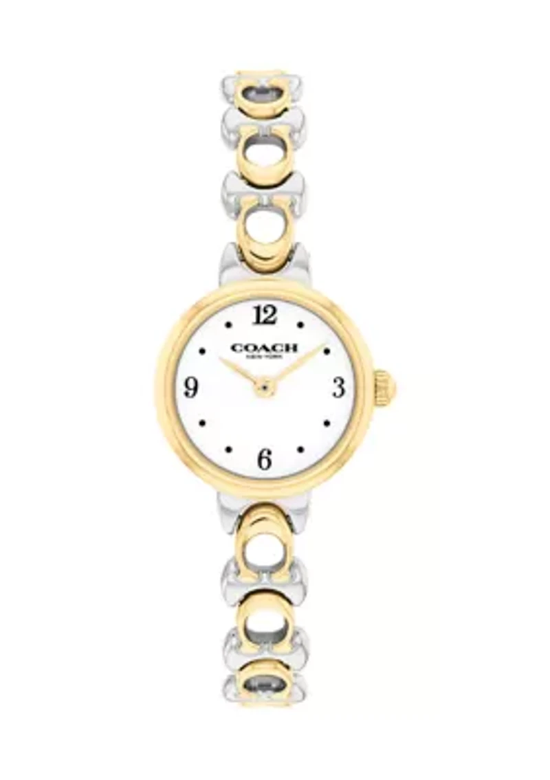 A classical round design, the COACH Iris watch is a refined choice for every day. Finished with a modern bracelet featuring the iconic Coach Signature, this two-tone stainless steel and gold-tone timepiece has a white lacquer dial with a mix of numerical and dome markers. Water-resistant to 99 feet Foldover clasp closure Analog dial Quartz movement Polished finish Full replacement warranty available for 2 years Imported Product Specifications 22.5 mm case size Material & Care Gold-tone metal, two-tone metal Spot clean only