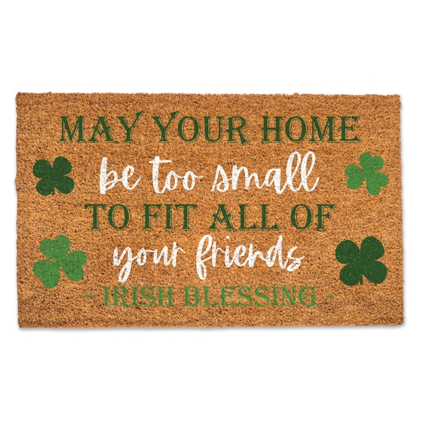 Welcome your favorite leprechauns into your home with this Irish Blessing Shamrock Doormat. It will put an endearing St. Patrick's Day touch on your porch! Doormat measures 30L x 18H in. Crafted of coir with a vinyl back Features the phrases "May your home be too small to fit all of your friends" and "Irish blessing" Shamrock accent Hues of brown, green, and white Water and mildew resistant Safe for covered outdoor use Designed and printed in the USA Care: Shake well periodically to prevent dirt build up. To maintain vivid colors, avoid direct exposure to sunlight. This item is available at Kirklands.com only, not available in stores. Please note: this item cannot be shipped to APO/FPO addresses.