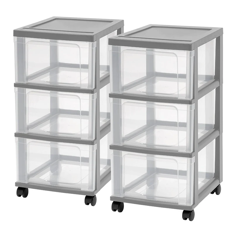 Tackle clutter and get your space organized with the 3-drawer plastic storage dresser! The storage drawers are built to smoothly glide open and closed to give you easy access to your things and the clear plastic material of the drawers lets you quickly spot whatever it is you're looking for. The plastic storage drawers are also designed with a narrow frame to make the most of limited space, making it perfect for dorms, apartments, offices, or anywhere that needs more storage but just doesn't have the room for it. The plastic drawer organizers have drawers that are deep enough to fit bulkier and larger items, making them an excellent addition to rooms that need a lot of storage and organizing space, and the removable caster wheels make for easy transportation from one room to the next. Let's get organized and make life a little easier.Details:Gray15 x 13 x 263 DrawersDesigned with a narrow frameOptional smooth-rolling wheels includedStackable without wheelsBuilt-in drawer stoppers