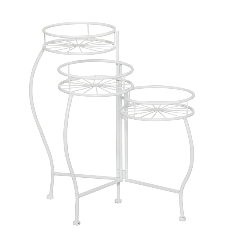 Add a speckle of charmed visual delight within your outdoor patios and garden areas as you decorate your corners with this foldable white metal plant stand. A space saving solution to store your plants in a playful yet practical way. This striking plantstand can hold your luscious greenery or display your most prized décor for an elevated look. Designed with rubber footing at the base that prevent scratching, anti tipping, as well as sliding around. This item comes shipped in one carton. Suitable for indoor and outdoor use. Avoid using abrasive cleaning pads or detergents, use a sponge with mild soap and warm water, then rinse with a garden hose. This plantstand is made from solid iron construction with protective coating making it impervious to the elements with anti-corrosive property. Transitional style.