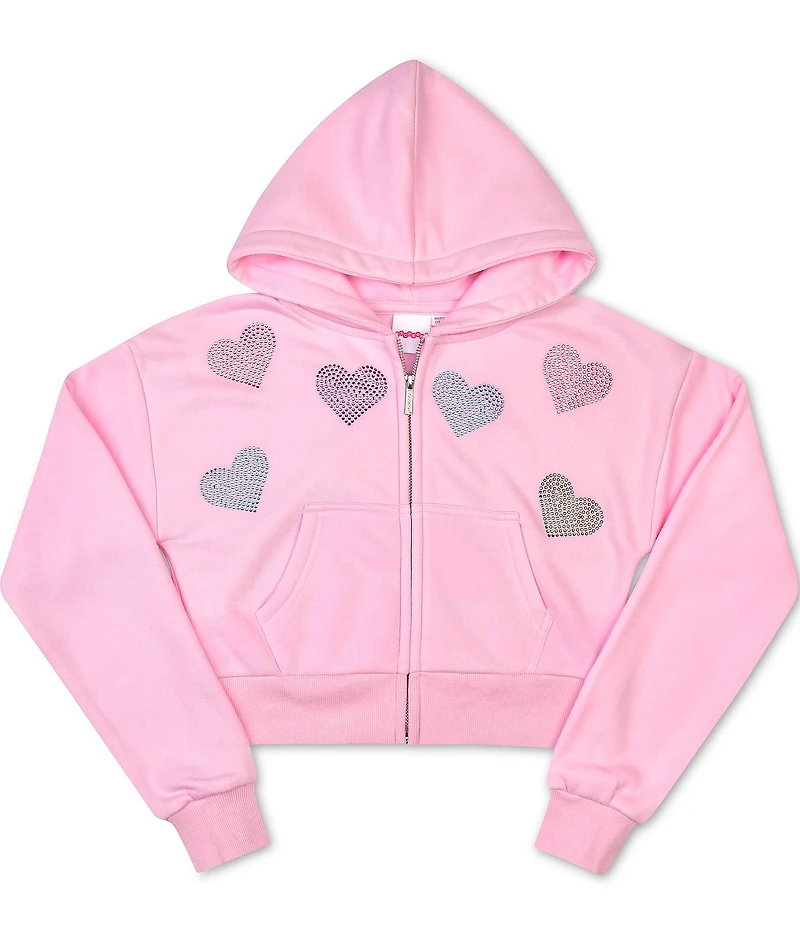 From Iscream, this sweatshirt features: Allover rhinestone heart print Attached hood Long sleeves Zip-front closure Kangaroo pocket Ruffle hem Polyester/cotton rayon Machine wash/tumble dry Imported.