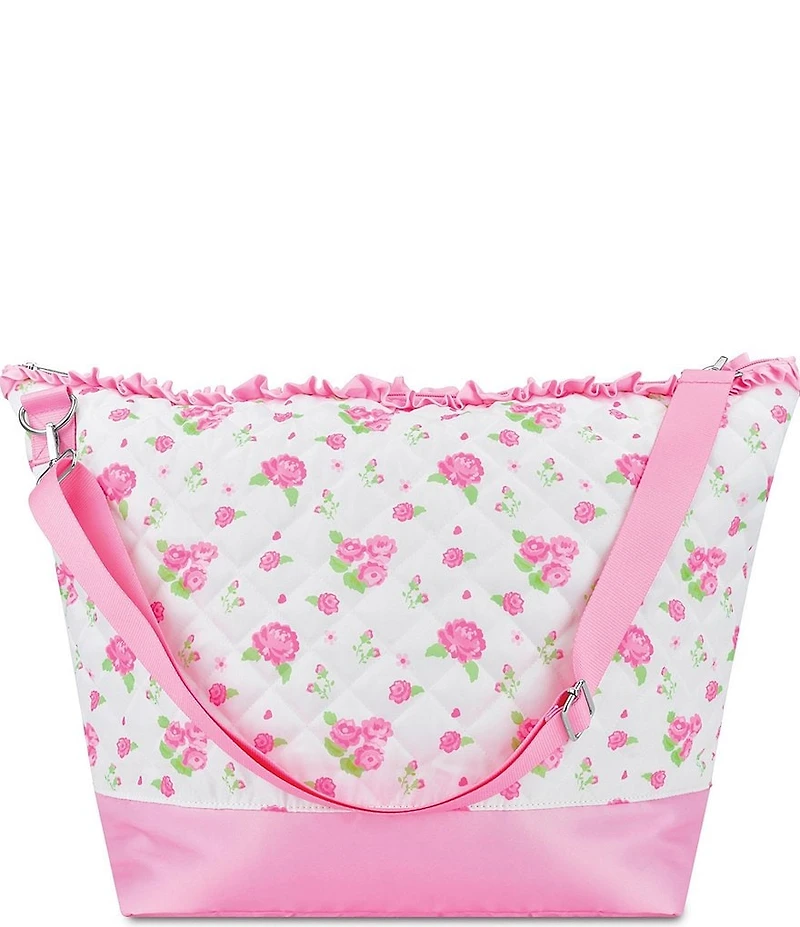 From Iscream, this bag features: Allover pink roses print Adjustable removable shoulder strap Ruffle zipper closure Inside zipper pocket Lined Approx. 23 1/2" wx16" hx9"d Nylon material Imported.