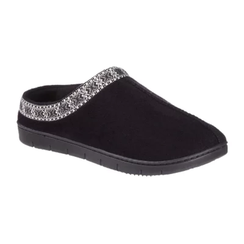 These Isotoner women's clog slippers have a cozy boho look and feel. This round closed-toe slip-on design is made from soft recycled faux suede and fleece with a patterned fabric trim and a flat platform rubber sole with grips for traction and support. Wear them with your favorite loungewear or PJs.