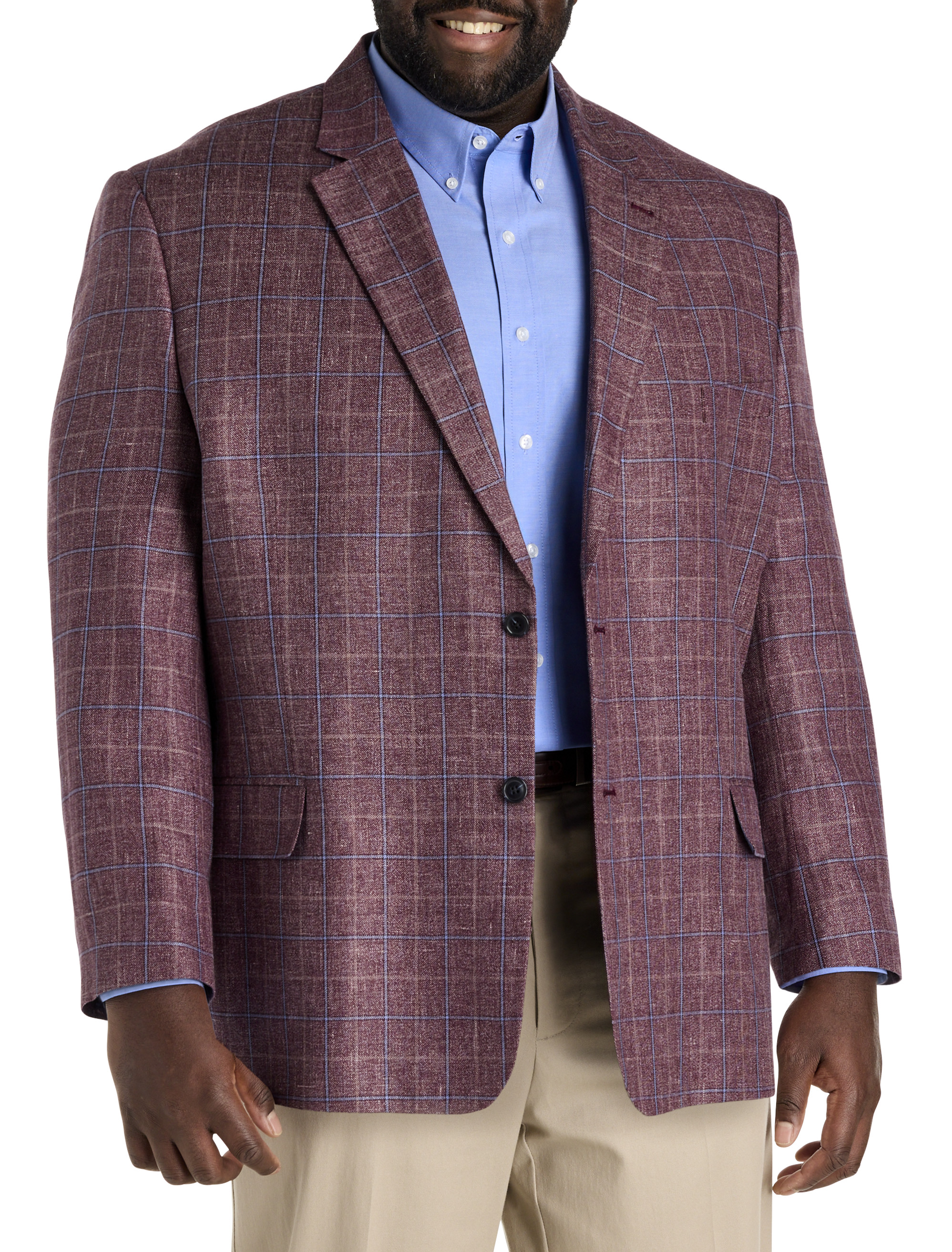 Modern yet timeless. Sourced from the renowned Reda mill in Italy, which exemplifies Italian mastery, joining artisan tradition with modern technological innovation to produce premium-quality fabrics, this versatile plaid sport coat is ideal for any season, specially designed at DXL with precise proportions and the perfect Big and Tall fit. Hidden Jacket-Relaxer stretch panels provide a more comfortable range of movement and sweat shields wick away moisture to help keep you feeling cool and dry. Sleek, sophisticated and a smart investment, it looks great paired with a crisp shirt and statement-making tie.
