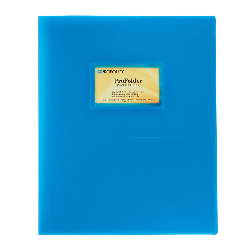 The two-pocket ProFolder is ideal for people who are tired of poor quality folders that crease tear and don't protect the papers inside. Truly designed with professionals in mind, the ProFolder by ProFolio is that will look great even after months of use. It's great for school classes, work projects, artwork, photography, invoices and more! No more scuffed corners and edges, and no scratches that show the white paper underneath. There's also a business card-sized clear pocket on the front cover so you can title and customize your ProFolder!Details:Available in assorted colorsHolds 8.5" x 11" letter sized paperWill not scuff or scratch easilyMade out of a durable polypropylene material