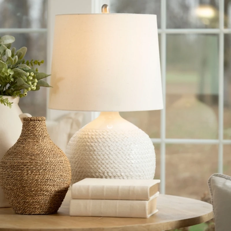 Bring a touch of modern sophistication to your space with this Ivory Ceramic Rope Table Lamp! Featuring a rounded ceramic base adorned with a subtle textured pattern, this lamp combines artistry with functionality. Lamp measures 28H in. Crafted of ceramic Ivory finish Round base with textured rope design Hardback tapered round shade in white fabric Shade measures 15 x 17 x 12 in. Socket accommodates a Type E60, 40W bulb Includes a 6 ft. plug-in cord Weight: 5 lbs. Care: Dust with a soft, dry cloth. Do not exceed specified wattage. Contact your local Kirkland's store for availability. Quantities and selection may vary by location.