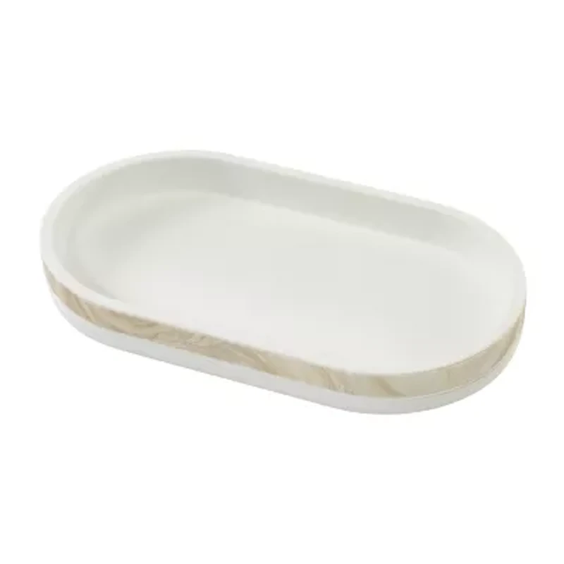 The Izod Tidal Decorative Vanity Tray features a solid white interior with the outside edge split between light brown marble on top and white on the bottom. Made of durable, hand-painted resin for easy care and long life. Measures W 5.5" x L 10" x H 1.15". Other matching bath accessories are also available. Shop the entire Izod bath collection of shower curtains, rugs, towels and bath accessories.