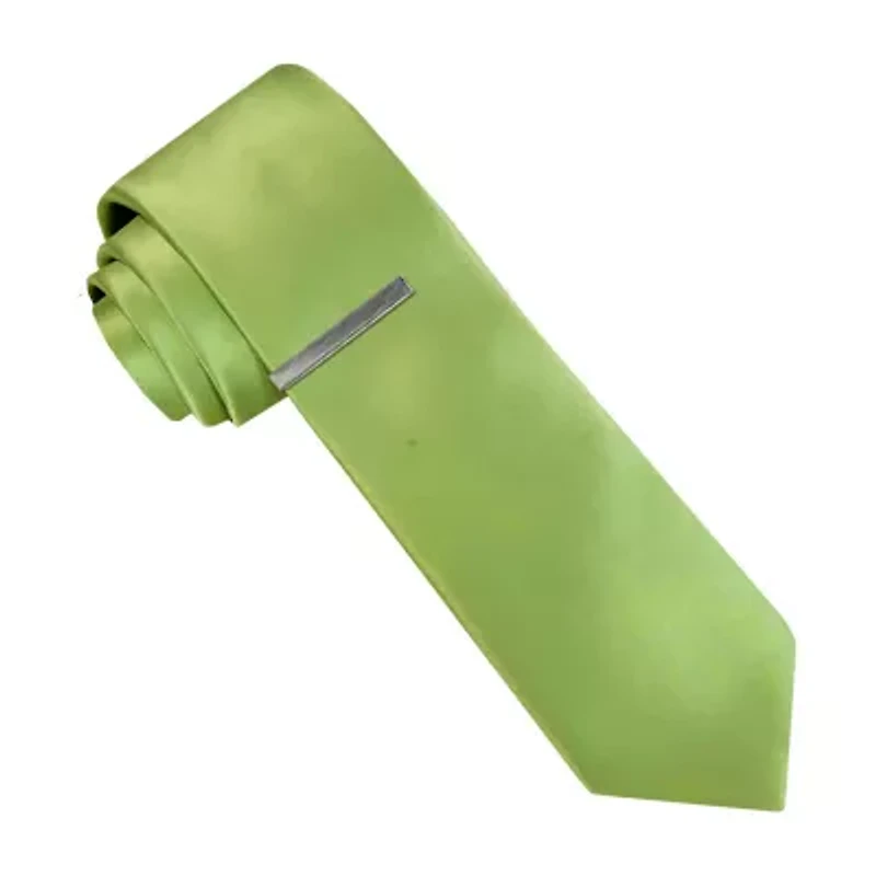 This J. Ferrar solid satin tie and tie bar set will elevate your look for your next special occasion. Wear it with a dress shirt and suit pants.