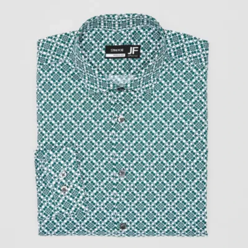 Upgrade your dress shirt collection with this J. Ferrar men's ultra comfort long-sleeve style designed with an all-over pattern. Made from recycled stretch-cotton poplin with wrinkle-free technology for all-day ease, it has a point collar and cuffed sleeves. Pair it with dress pants and oxford shoes.