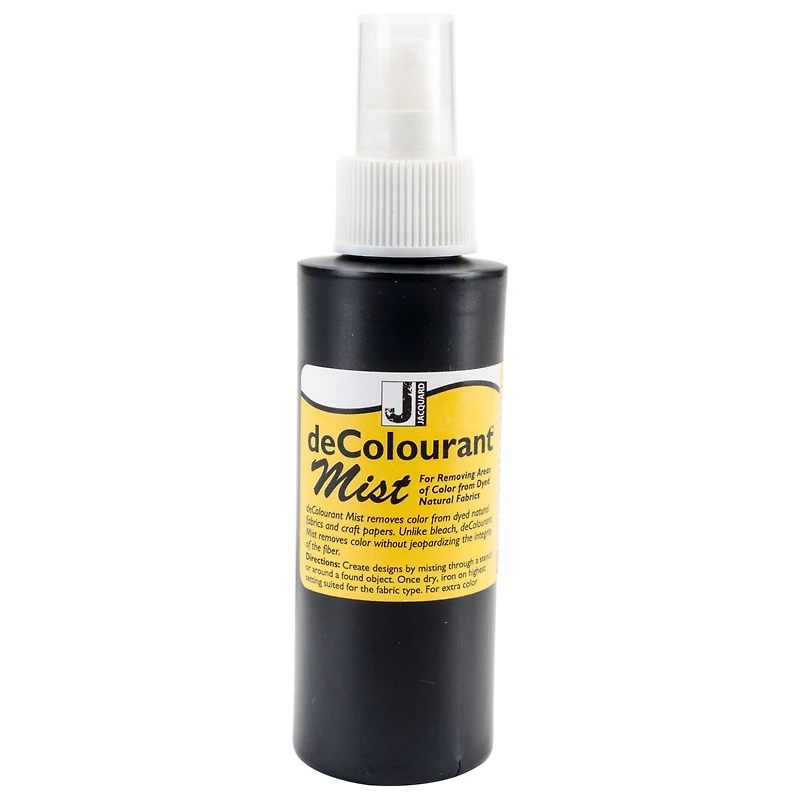 Jacquard deColourant Mist is a mist for removing areas of color from dyed natural fabrics such as cotton, linen, silk and wool. Unlike bleach, this deColourant is ideal for removing color from fiber without jeopardizing the integrity of the material. Details: 4 fl. oz. (118.29 mL) Heat activated Ready to use Formerly known as Discharge Paste