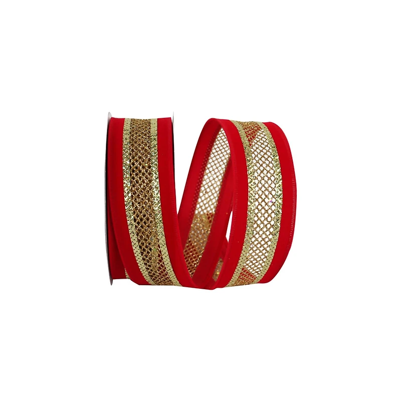 Traditional reds and golds are a Christmas classic. This red velvet ribbon with a gold mesh center is perfect for wreaths, gift wrap, decorating trees, and more. The wired edge will help you create beautiful bows that hold their shape.Details:Red and gold1.5" x 10yd.Mesh and velvetWired80% Polyester 20% Acrylic