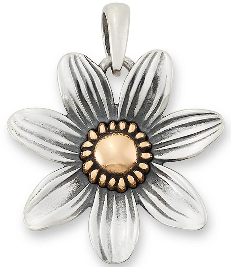 From James Avery, this pendant features: The Full Bloom Pendant is a like a beacon, welcoming spring and all its newness. Inspired by the daisy, this artistic flower has wide-open sterling silver petals and a bronze center, all designed with incredible detail. Notice the delicate lines on each petal and the seed-like circle frame around the center. Wear this mixed metal statement pendant on a chain or charm holder. Sterling silver and bronze Approx. 15/16" diameter Crafted in America using the world's finest materials.